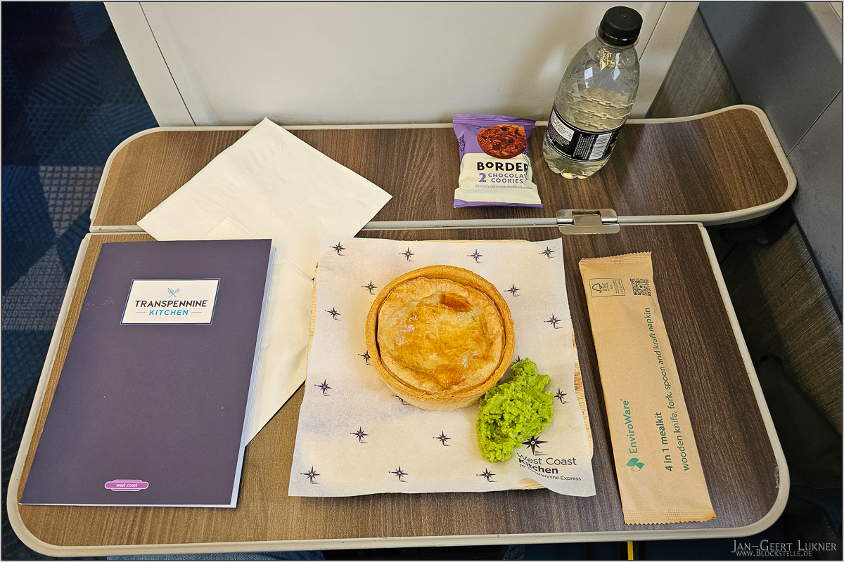 Zu unserer Überraschung bekamen wir nach der ersten Kaffeeversorgung in der ersten Klasse sogar Speisekarten für richtiges Mittagessen ausgehändigt. Man ließ sich allerdings Zeit mit der Bestellungsaufnahme, so dass wir nicht sicher waren, ob wir vor Carlisle etwas abbekommen. Um 10:58 kam er durch, um die Bestellung aufzunehmen. Als ich ihn fragte, ob bis Carlisle noch genügend Zeit sei, eilte er sogleich in die Küche zurück und schob meinen Pie in den Ofen. Erst danach nahm er die restlichen Bestellungen auf. Um 11:04 hatte ich den dampfenden Pie vor mir stehen.