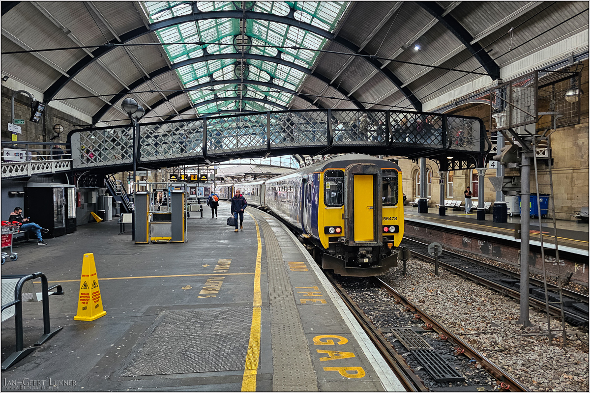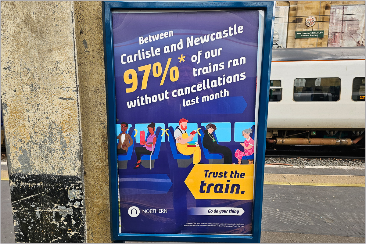 Der Zug bestand sogar aus zwei 156ern, hatte also vier Wagen und war schön leer. Erst auf Newcastle zu kamen mehr Fahrgäste rein. Der Pfiff ertönte in Carlisle wie in GB üblich eine halbe Minute vor Abfahrtszeit, die Türen wurden geschlossen. Zehn Sekunden vor Abfahrt ging es los - die Motordrehzahl wurde sanft hochgefahren, das Vibrieren setzte ein und exakt mit Zeigersprung setzte sich der Zug in Bewegung. Train Agent war ein Jungelchen in Trainigsjacke (mit Northern-Beschriftung!) und mit Rucksack. Die Strecke war erwartungsgemäß äußerst lovely. Es ging durch saftige Hügel. Mal kreuzten Footpathes die Linie, mal sah man Signalboxes mit Formsignalen. Der mittlere Teil der Strecke hatte allerdings Lichtsignale. Ein komisches Siding war Greengate (östlich Haltwhistle), wo das Ausweichgleis mit Zaun abgesperrt, aber mit irgendwelchen uralten Lichtsignalen in dichten Abständen versehen war.