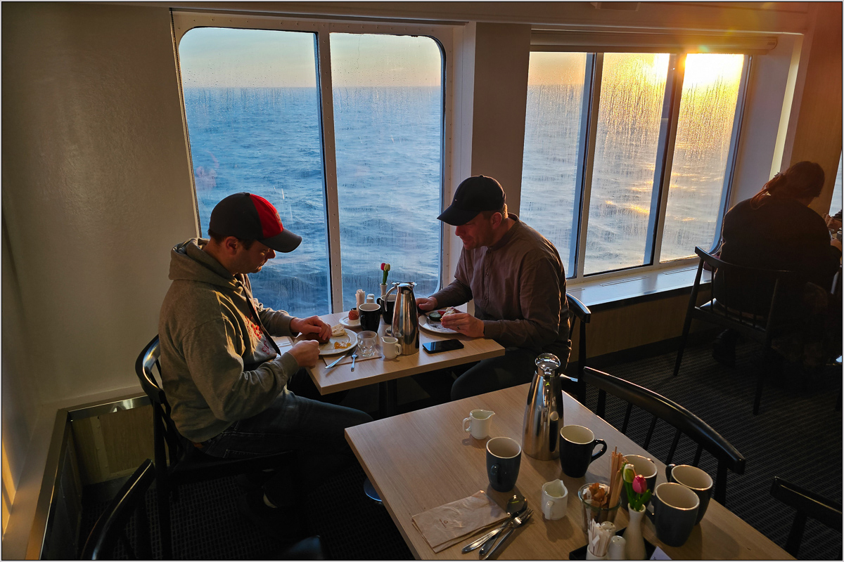 Eiserne Disziplin - das erforderte nun die Koordination einer fünfköpfigen Gruppe ohne Datenroaming, mit teils noch auf GMT laufenden Uhren auf einem Schiff, auf dem MEZ galt. Den ersten Programmpunkt, das Abendbuffet, bewältigten wir schon mal mit außerordentlicher Bravour. Zur Belohnung haben wir viel zu viel gefressen. Besonders der Lachs mit Nudeln hatte es mir angetan.