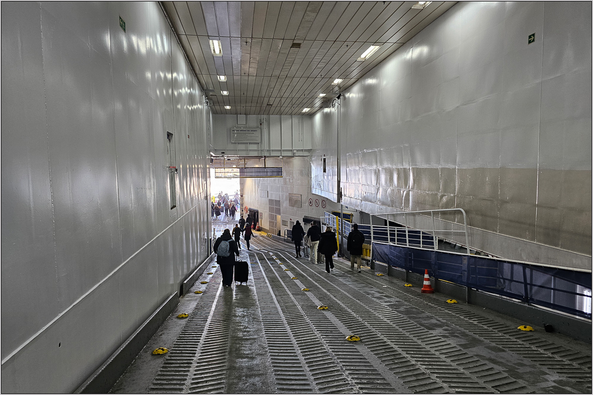 Spannend wurde es nach dem Anlegen. Es wurde verkündet, dass sich die Gangway nicht an das Schiff schubsen lässt. Das war ja mal doof. Zwei und eine Viertelstunde Übergang zum Zug, die uns zuvor viel zu reichlich erschienen waren, begannen plötzlich zusammenzuschmelzen. Nichts tat sich. Erst nach einer halben Stunde durften wir die Fähre über das Autodeck verlassen. Das machte einen eingeübten Eindruck, kommt vielleicht häufiger vor... Das nächste Hindernis war die Einreise in die EU. Hier standen wir weit hinten und mussten auch nochmal 20min warten. Wieso gibt es eine (von vier) Spuren für EU-Bürger, wenn man dann doch zu einer der anderen Spuren gescheucht wird?