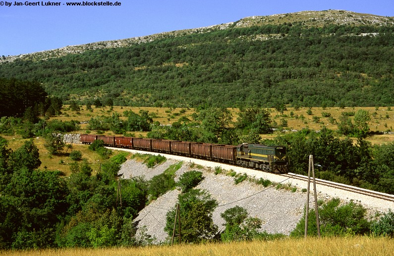 Einziges Problem: Es tat sich nichts - außer dass der Rastplatz mitten in der prallen Sonne lag und wir uns einen Sonnenbrand holten. Vom letzten Jahr wussten wir allerdings, dass vormittags irgendwann zwar auf der Hauptstrecke nix los ist, aber die Bakarbahn sowohl zum Öl-, wie auch zum Erzhafen bedient wurde. Als wir keine Lust mehr hatten, fuhren wir hoch zum Abzweigbahnhof Škrljevo - und drehten gleich wieder um. Der Tf eines abfahrbereit stehenden Erz-Leerzuges bekam gerade letzte Papiere in die Lok gereicht. Wir erwischten den Zug dann noch auf allen Ebenen der Bakar-Rampe.