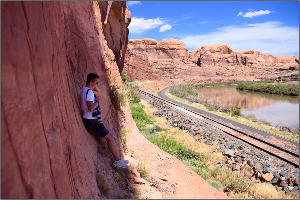 Für mein Hauptmotiv waren mir die fehlenden Wagen egal: Hier wird gerade der Wanderweg zum Corona Arch gequert, bevor man in den Bootlegger Canyon einbiegt.