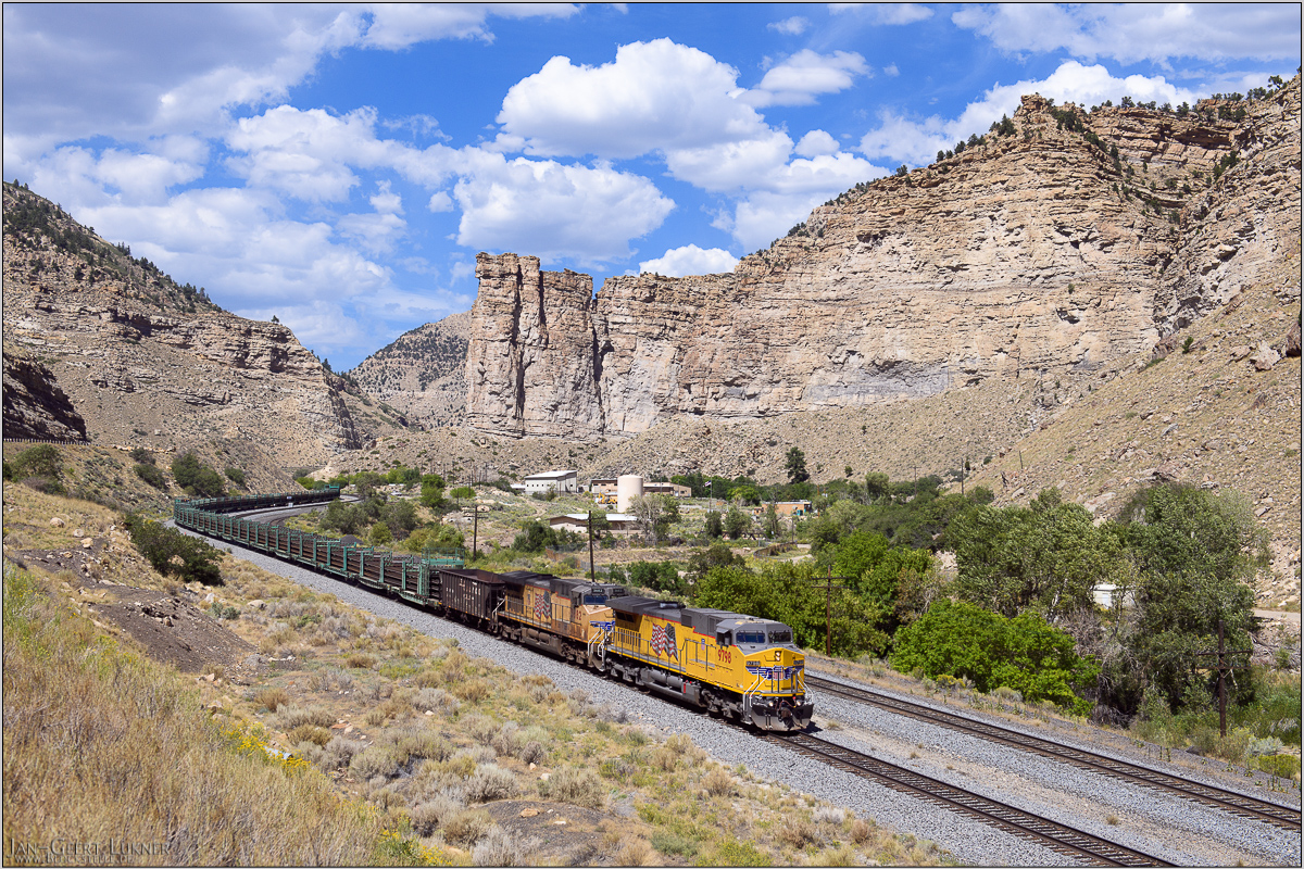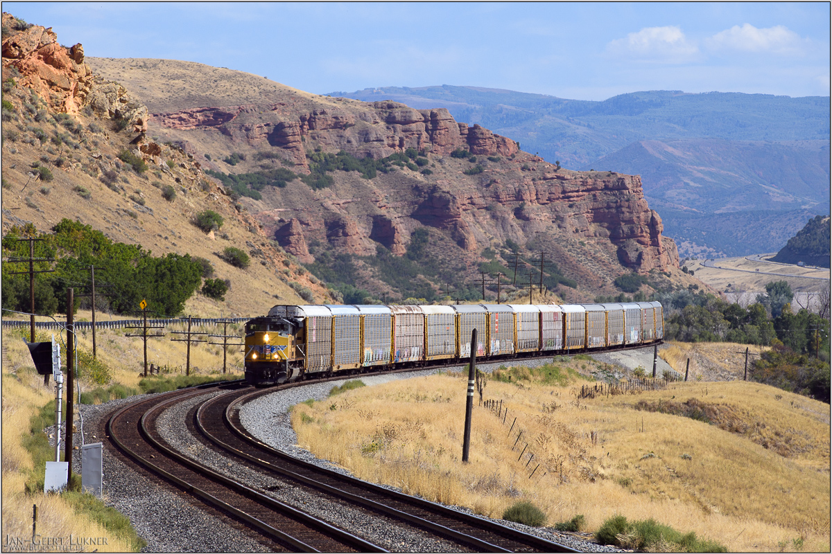 Wir befinden uns hier an der UP Green River Subdivision, die zusammen mit der Moffat Tunnel- und Glenwood Springs Subdivision im Osten und der Provo Subdivision im Westen eine durchgehende Strecke von Denver in den Ballungsraum um die Große Salzseestadt bildet. Im Güterverkehr spielt diese eingleisige Verbindung (nur die Provo-Subdivision westlich Helper ist zweigleisig) allerdings eher eine regionale Rolle. Die großen Ferngüterzüge verwenden wohl lieber weniger steigungsreiche Strecken. Im Bf Brendel zweigt von der Green River Subdivision die UP Cane Creek Subdivision ab, jene Strecke in die Coloradoschlucht bei Moab, auf der einmal wöchentlich die Übergabe "Potash Local" in die grandiose Felsenwelt eintaucht.